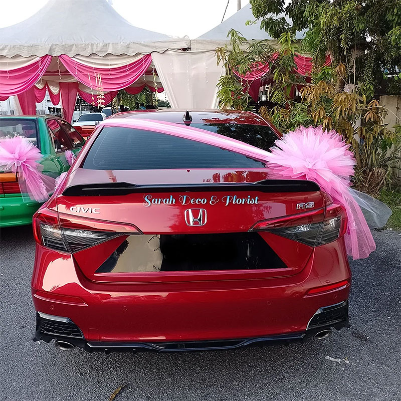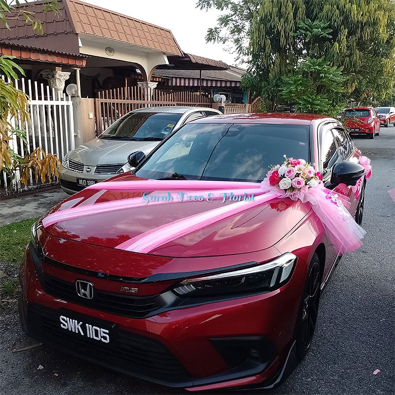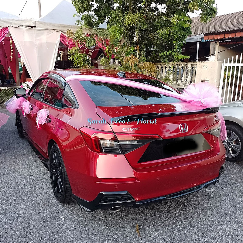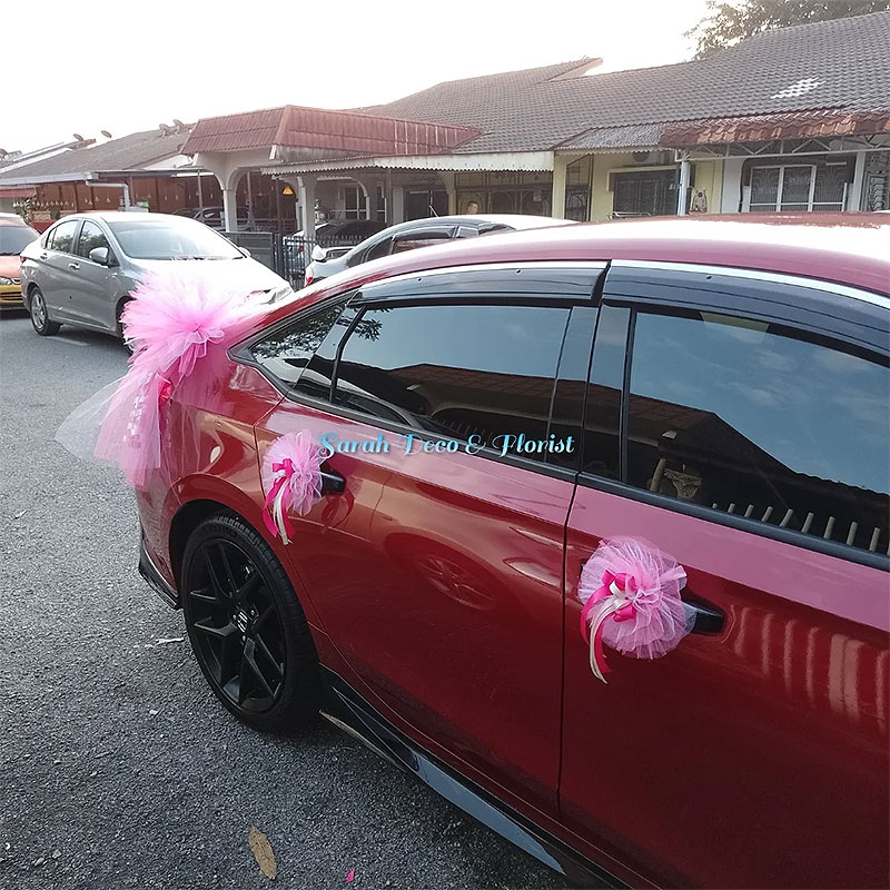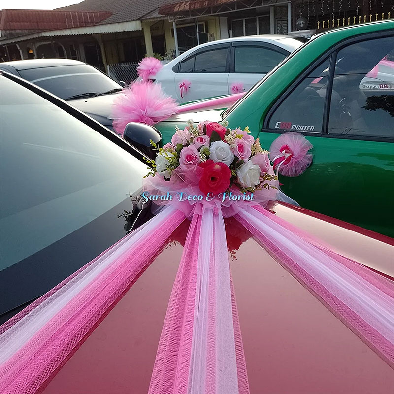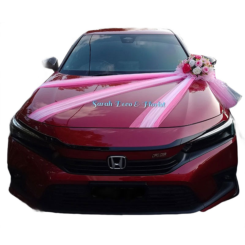 The Dandelion premium wedding car decor features soft tulle elegantly draped in broad diagonal bands across the bonnet, converging near the right headlight. A lush bouquet of roses, blush, and vibrant matching color anchors the design, accented with delicate greenery for contrast. The airy tulle creates a light, floating effect against the car’s deep paint, giving a romantic, upscale look ideal for weddings or special occasions, befitting its premium category.