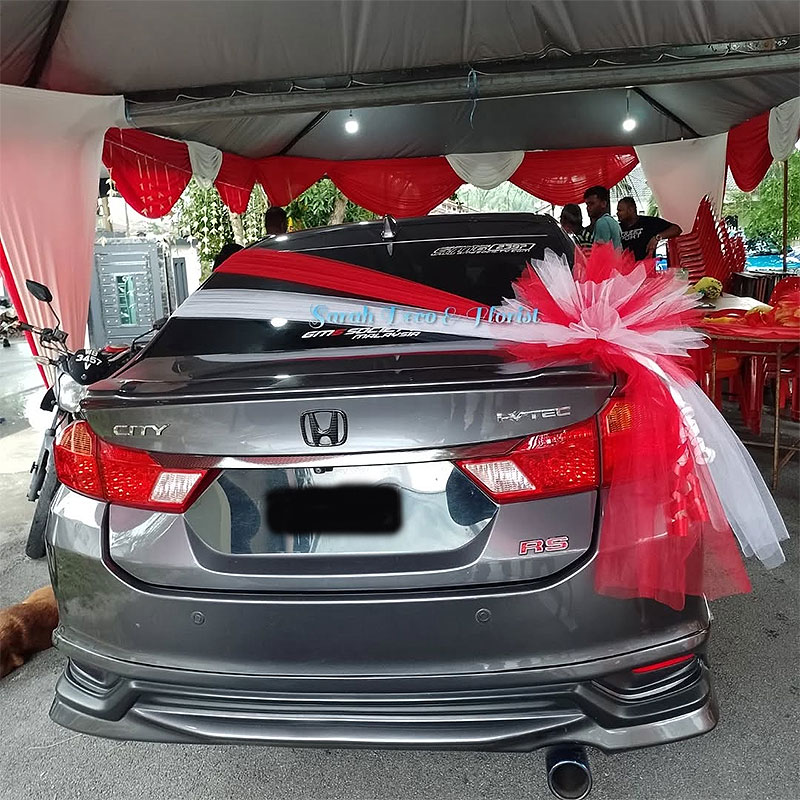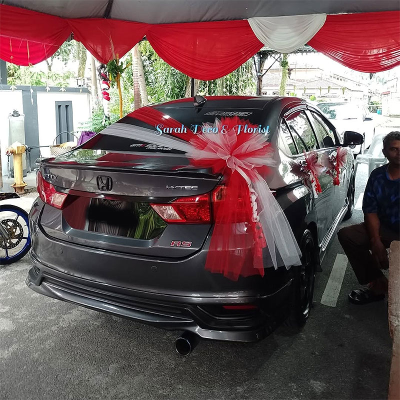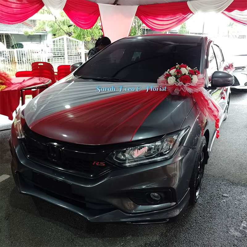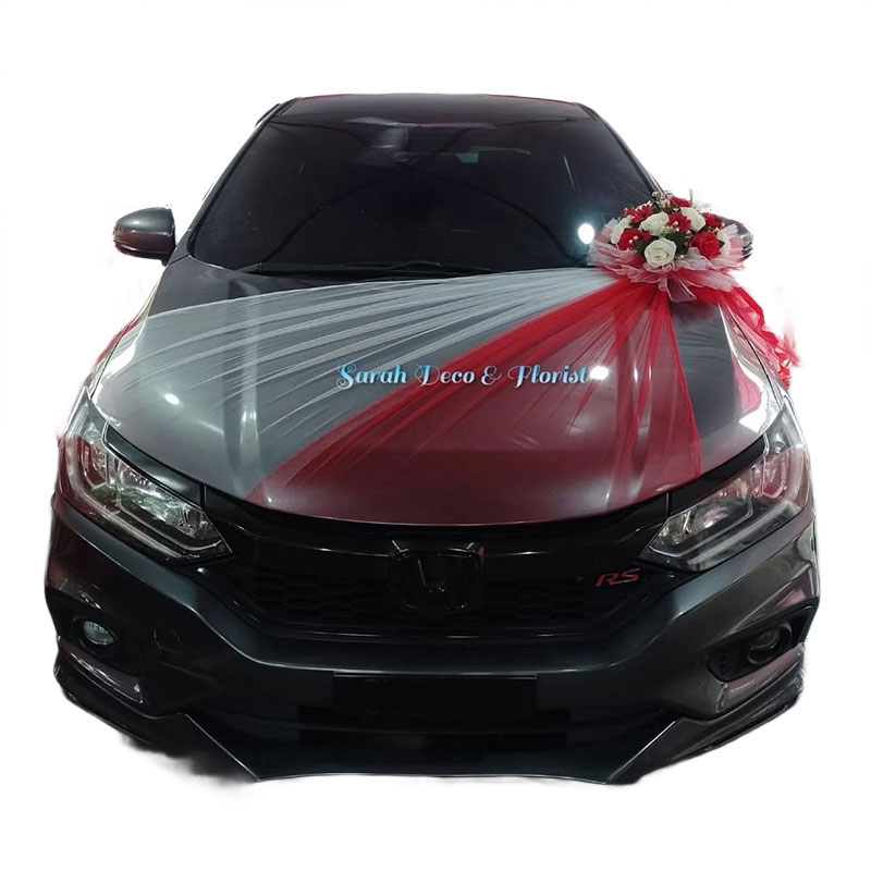 The Poppy Design features a bold yet elegant wedding car decoration inspired by the vibrant beauty of flowers. Soft nets are neatly draped across the hood in a classic curtain-style, drawing attention to the striking floral centerpiece at the corner of the hood. The arrangement showcases rich toned blooms blended with complementary flowers, creating a lively and romantic focal point. A flowing net cascades down the front, while matching side accents complete the look, making this design perfect for couples who love expressive, eye-catching elegance.