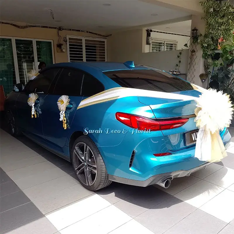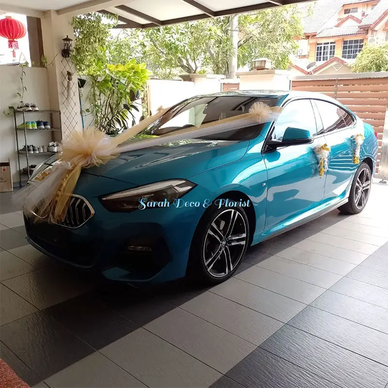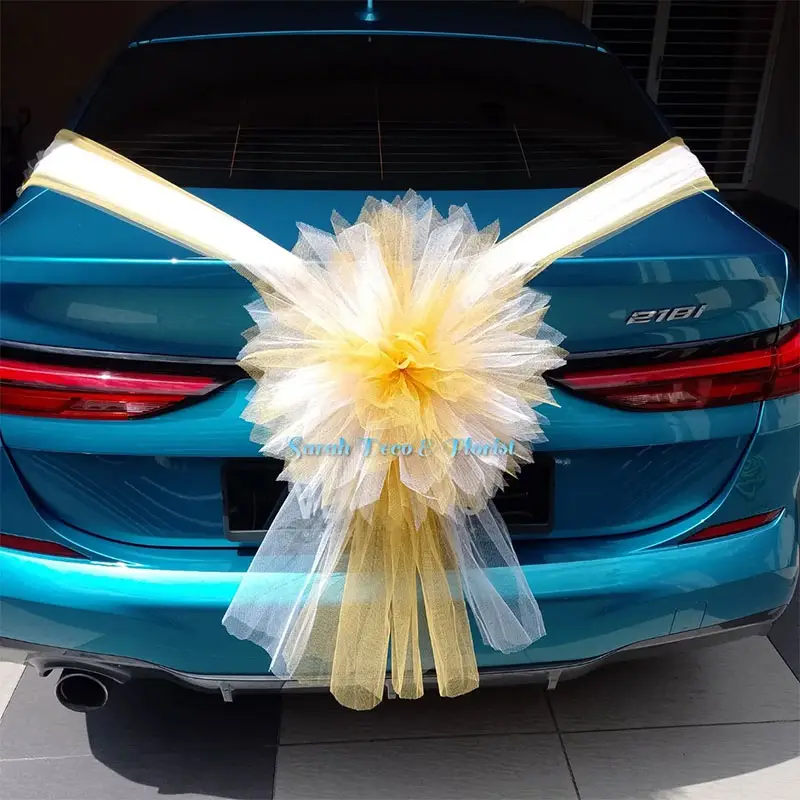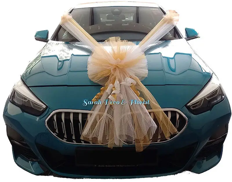 Orchid design highlights an elegant wedding car decoration featuring a large, voluminous colored tulle bow gracefully arranged at the front. Accented with delicate ribbons, the soft layers of tulle create a romantic and celebratory centerpiece designed to draw attention. The glossy surface beneath subtly reflects daylight, enhancing the refined presentation. Set against a plain background, the scene keeps full focus on the beauty and detail of the decoration.